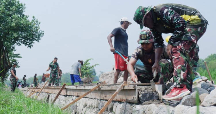 Mojokerto - Program TNI Manunggal Membangun Desa (TMMD) ke-126 Kodim 0815/Mojokerto terus menunjukkan progres positif di Desa Sumbertanggul, Kecamatan Mojosari, Kabupaten Mojokerto, Kamis (09/10/2025). Seiring berjalannya waktu, semangat gotong royong antara prajurit TNI dan warga setempat kian terasa dalam pengerjaan sejumlah sasaran fisik, salah satunya pembangunan Tanggul Penahan Tanah (TPT) yang kini telah mencapai 25 persen dari total target pengerjaan.