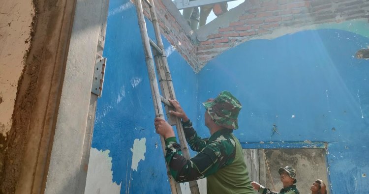 Mojokerto - Program TNI Manunggal Membangun Desa (TMMD) ke-126 Kodim 0815/Mojokerto terus menunjukkan progres signifikan. Salah satu sasaran fisik yang menjadi perhatian utama adalah rehabilitasi Rumah Tidak Layak Huni (RTLH) milik warga Dusun Glogok, Desa Sumbertanggul, Kecamatan Mojosari, Kabupaten Mojokerto, Jawa Timur, Kamis (16/10/2025). Hingga hari ketujuh pelaksanaan, pekerjaan rumah milik Sujamaji telah mencapai sekitar 35 persen dengan fokus pengerjaan pada pemasangan rangka atap baja ringan.