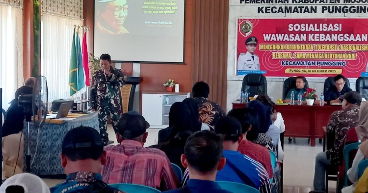 *Mojokerto - * Dalam upaya memperkuat semangat kebangsaan di tengah arus globalisasi dan kemajuan teknologi informasi, Kodim 0815/Mojokerto melalui Koramil 0815/11 Pungging bersinergi dengan Forkopimcam menggelar kegiatan Sosialisasi Wawasan Kebangsaan (Wasbang) kepada masyarakat Kecamatan Pungging. Kegiatan ini berlangsung di ruang pertemuan lantai 3 Kantor Kecamatan Pungging, Jalan Brawijaya Nomor 101, Desa Tunggalpager, Kabupaten Mojokerto, Jawa Timur, Sabtu (18/10/2025).